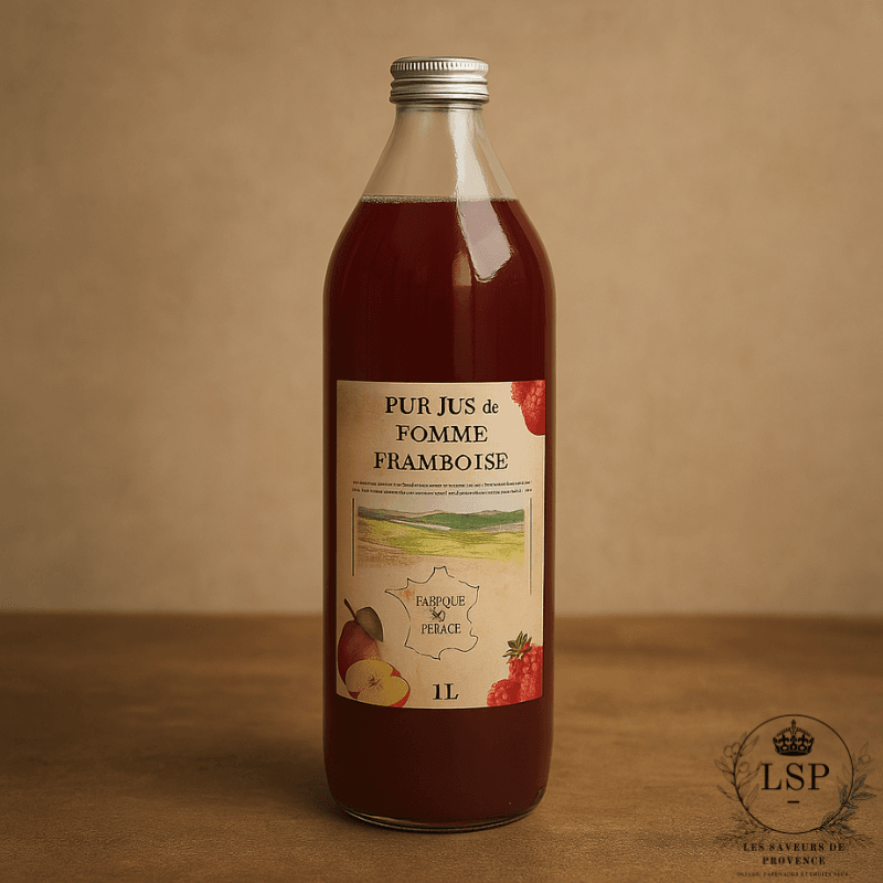 La pomme, riche en jus et en arômes doux, constitue la base. La framboise est ensuite ajoutée sous forme de purée ou de jus épais, ce qui apporte toute sa richesse aromatique, sa couleur rouge éclatante et son intensité olfactive. Le résultat est un jus parfaitement équilibré, rond, fruité, légèrement acidulé et très parfumé.