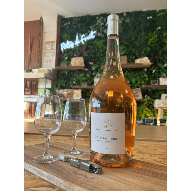 La cuvée Juliette de la Famille Manganelli est un magnum rosé Côtes du Rhône bio certifié Agriculture Biologique, élaboré au cœur du Vaucluse, à Beaumes-de-Venise. Un grand format de 1,5 litre pensé pour être posé au centre d’une table, ouvert sans compter, partagé jusqu’au bout. Frais, fruité, immédiatement séduisant — c’est exactement ce qu’on attend d’un rosé de caractère pour une belle occasion.
